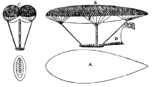 Balloons had being flying since 1783 and there were many attempts to make them navigable with some form of propulsion. George joined in. In 1816 he published his first paper on airships. He argued that they should be large. As size increases, weight and air resistance increase as the square of the dimensions, whereas lifting force increases as the cube. And airships should be the right shape. His earlier work on air resistance had shown that a shape ‘like a well-fed trout’ was needed. So far, so good. He still believed that the propulsion would come from flappers though they are not shown in this sketch.
